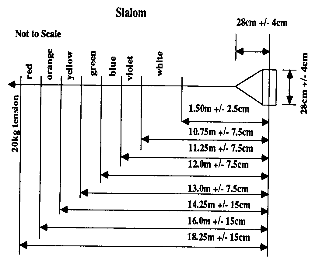 Slalom Tow Line: The tow lines to be used for slalom shall have loops spliced into the line at distances from the handle of 16 meters, 14.25 meters, 13 meters, 12 meters, 11.25 meters, and 10.75 meters. A tolerance of plus or minus 15 cm on the distance from the loop to the handle is allowed for rope lengths at 18.25 m and 14.25 m. From the 13 m rope length and on, this tolerance is reduced to plus or minus 7.5 cm.